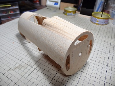 24/11/02:胴体前部の状況 最前部の胴枠は1mmベニア。プランクは1mmバルサシート。機銃カバー部は1×3mmのバルサシートをストリッププランキングで覆った。