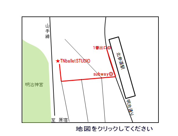 北 参 道 駅 改 札 を 出 て 左 に 曲 が り 地 下 1 番 出 口 へ 地 下 出 口 か ら 左 手 に 進 み